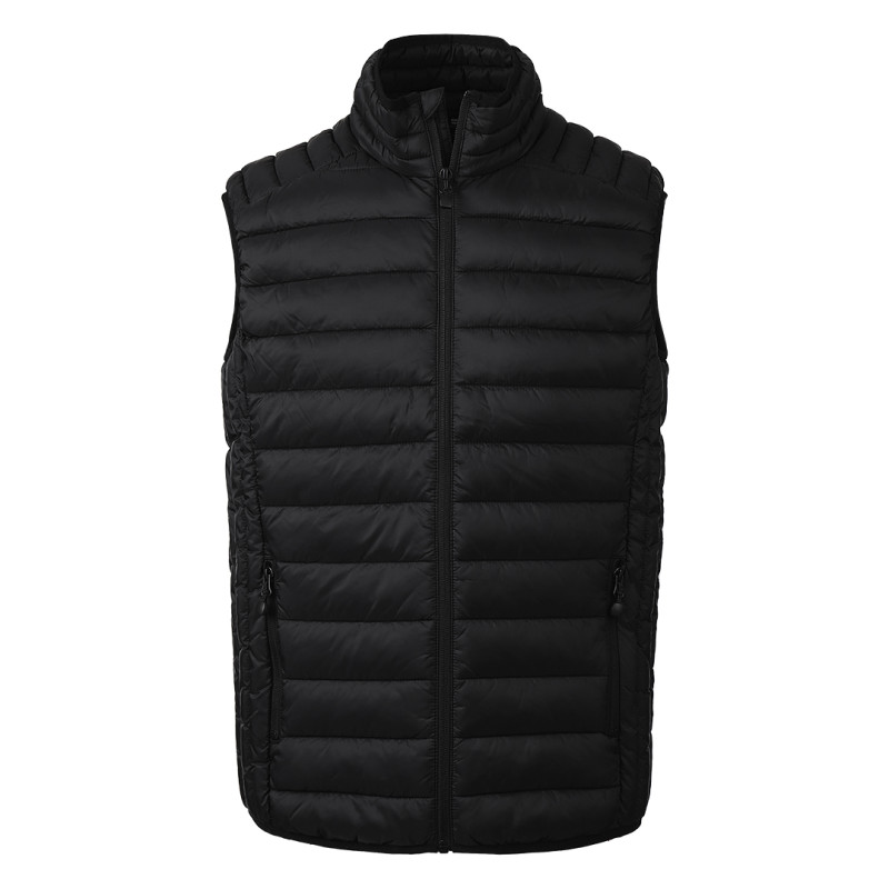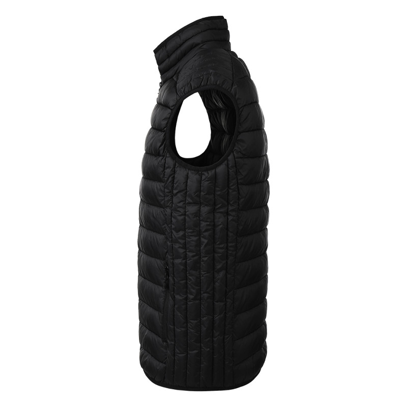 Bodywarmer with light padding, quilted, two front pockets, elastic piping around the shoulders, hood, and pockets, storage pouch