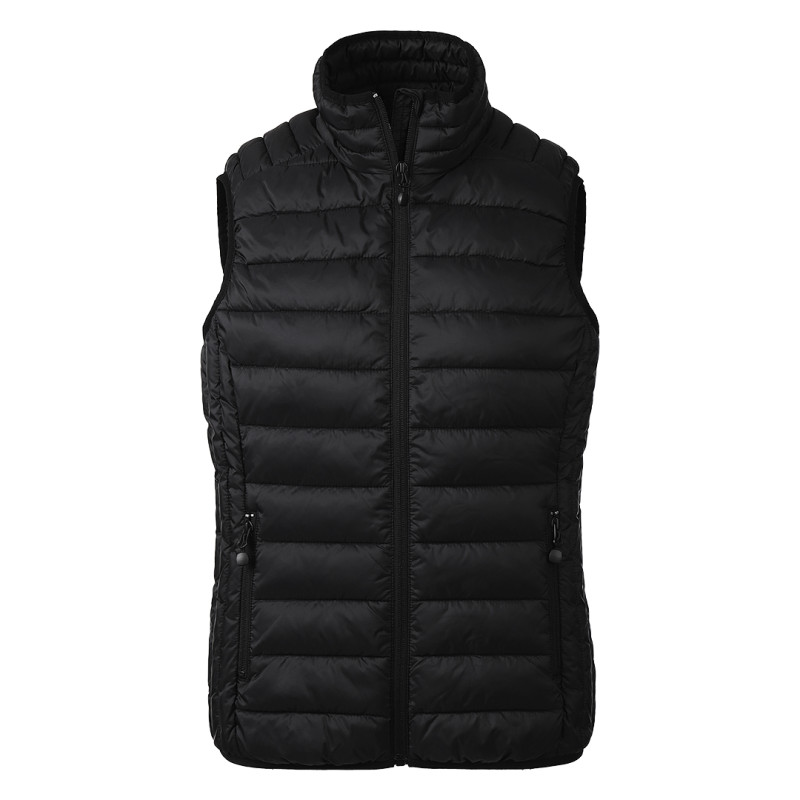 Women's vest with light padding, slightly tailored, quilted, two front pockets, elastic piping around the shoulders, hood, and pockets, storage pouch