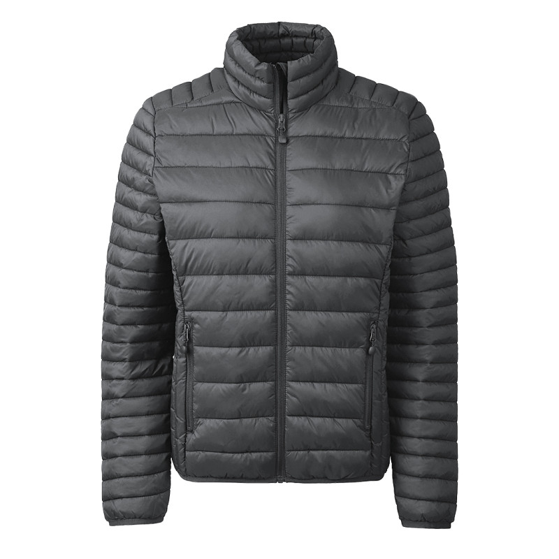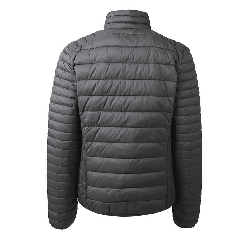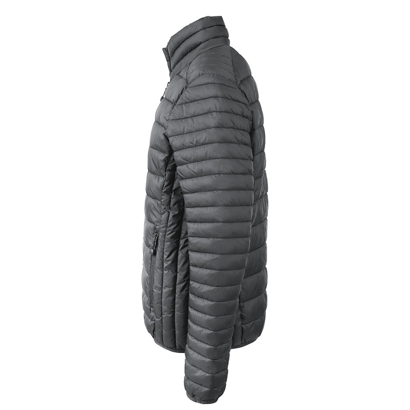 Jacket with light padding, quilted, two front pockets with zippers, elastic piping on the sleeves, and bottom, storage pouch