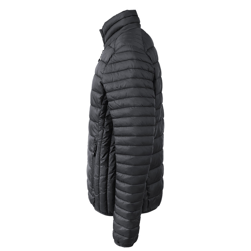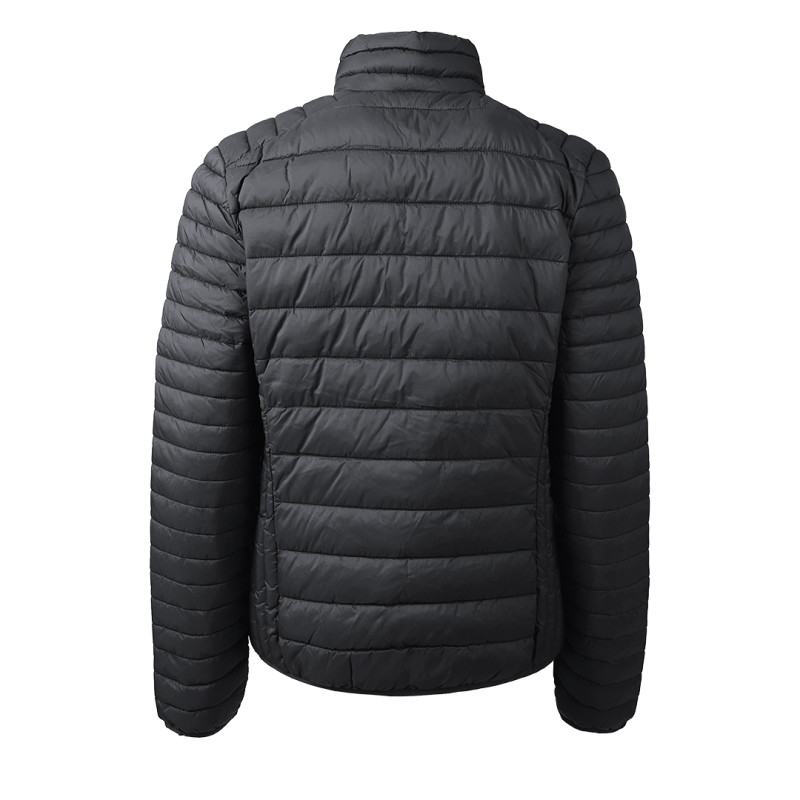 Women's jacket with light padding, quilted, two front pockets with zippers, elastic piping on the sleeves, and bottom, storage pouch