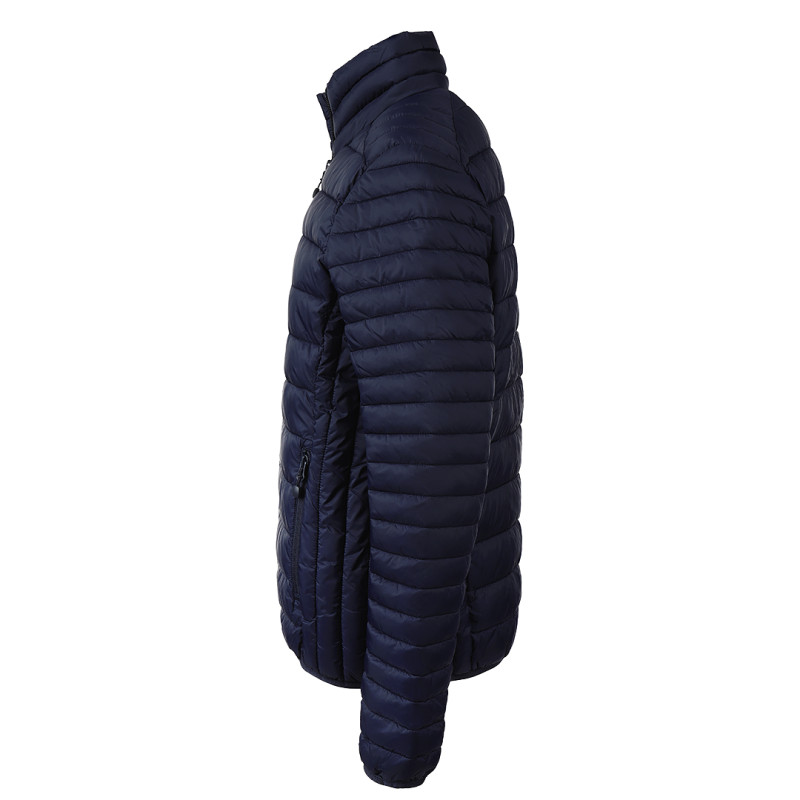 Women's jacket with light padding, quilted, two front pockets with zippers, elastic piping on the sleeves, and bottom, storage pouch