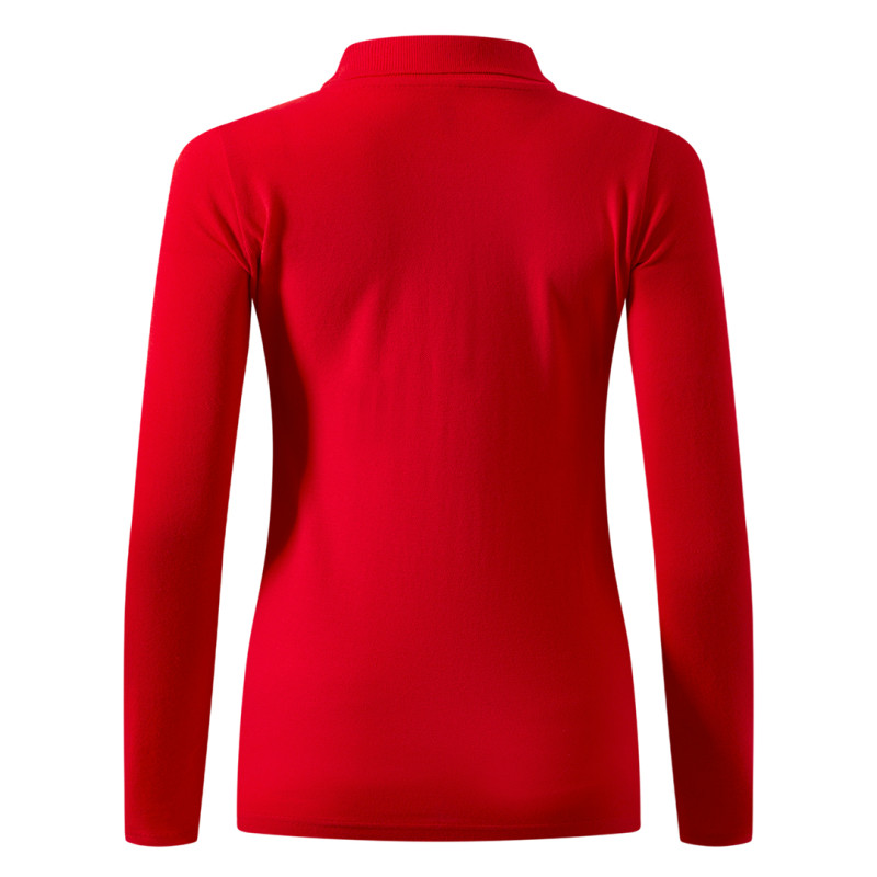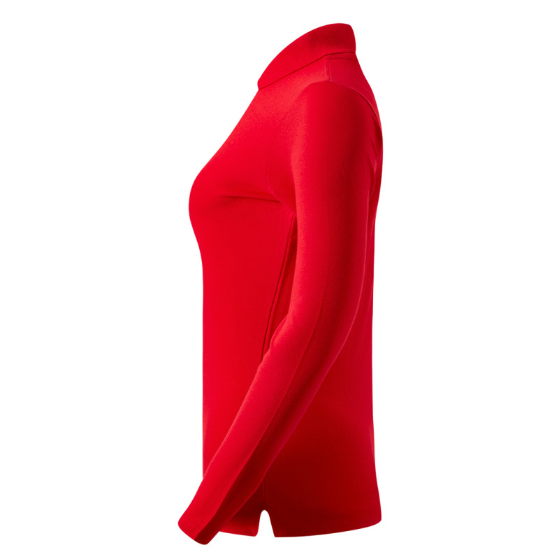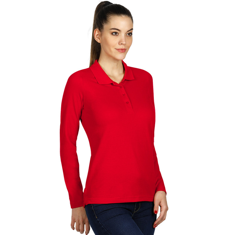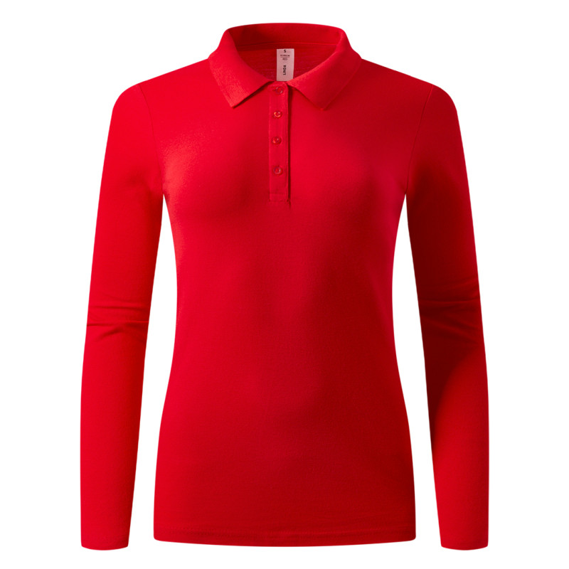 Women's long sleeve polo shirt, 200 g/m2, adjusted fit, side seam, double stitching at sleeves and bottom, side slit, four tone-to-tone buttons, spare button, reinforcement tape at neckline and topstitch at shoulder line
