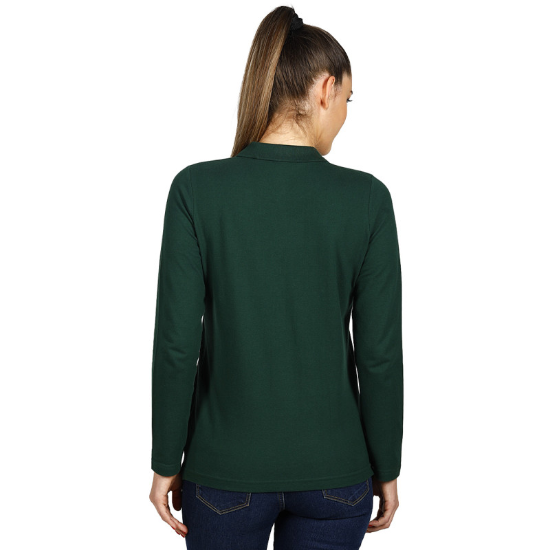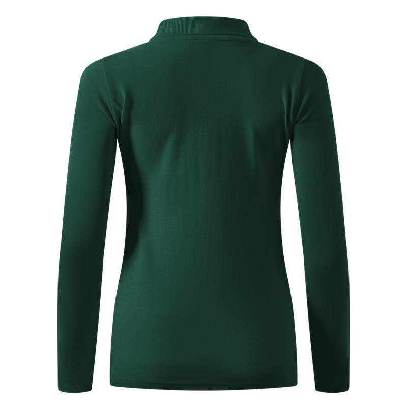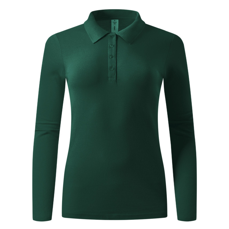 Women's long sleeve polo shirt, 200 g/m2, adjusted fit, side seam, double stitching at sleeves and bottom, side slit, four tone-to-tone buttons, spare button, reinforcement tape at neckline and topstitch at shoulder line