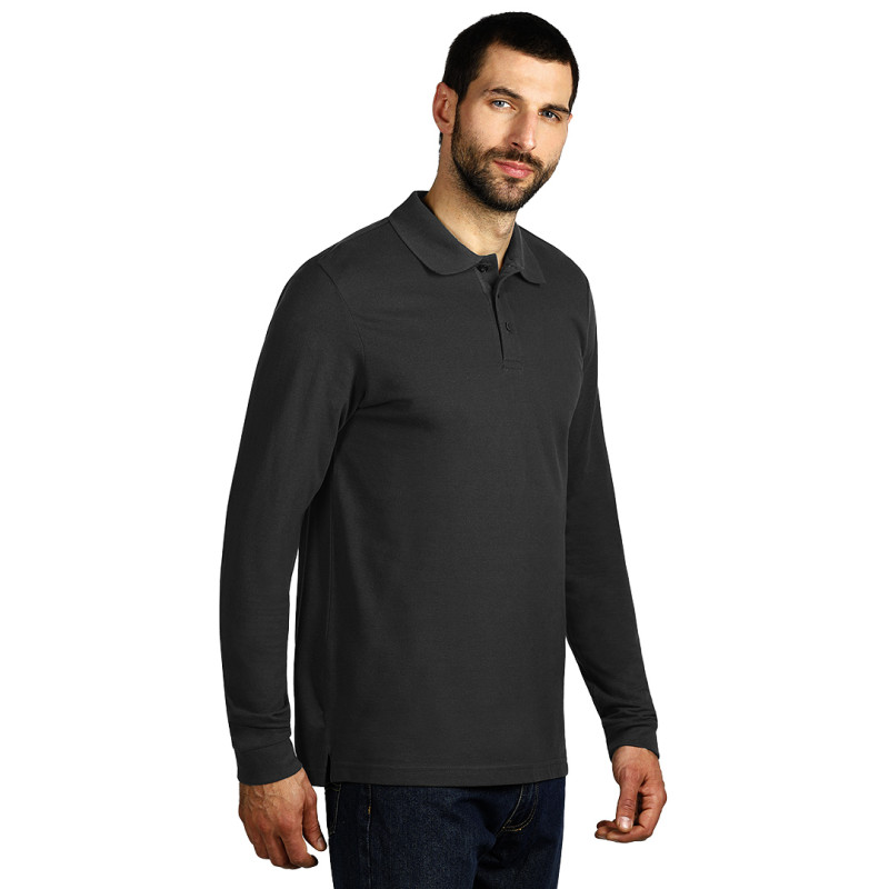 Long sleeve polo shirt, 200g/m2, side seam, elasticated cuffs, double stitching at bottom, three tone-to-tone buttons, spare button, reinforcement tape at neck line