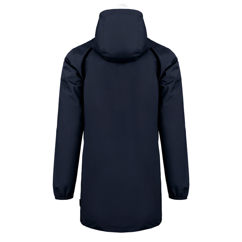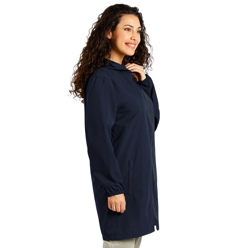 Raincoat made of recycled polyester with a polyurethane coating, high collar, hood folded into the collar with a drawstring, two front pockets, elastic cuffs on the sleeves, and a waterproof zipper