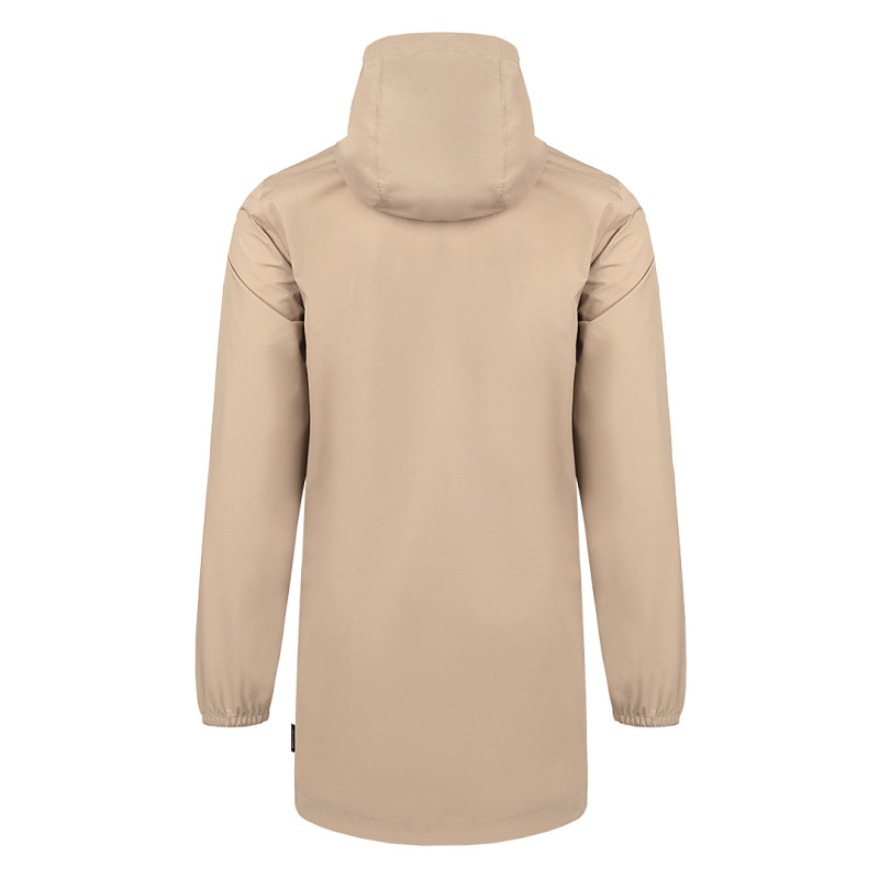 Raincoat made of recycled polyester with a polyurethane coating, high collar, hood folded into the collar with a drawstring, two front pockets, elastic cuffs on the sleeves, and a waterproof zipper