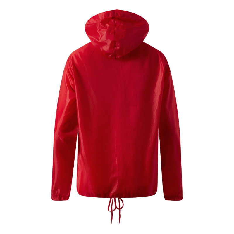 Windbreaker with high collar, hood folded away inside the collar, collar closed with velcro tapes, two front pockets, elasticated cuffs, adjustable tone-to-tone drawstrings at bottom