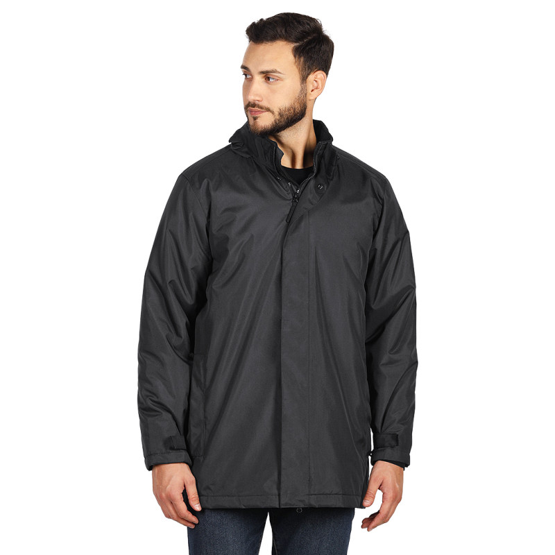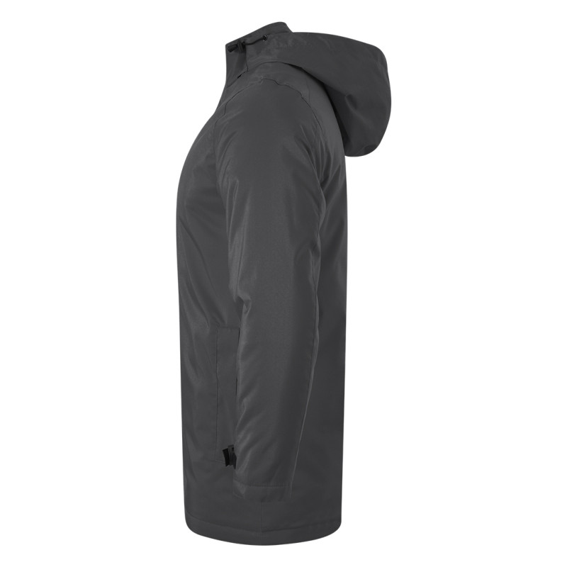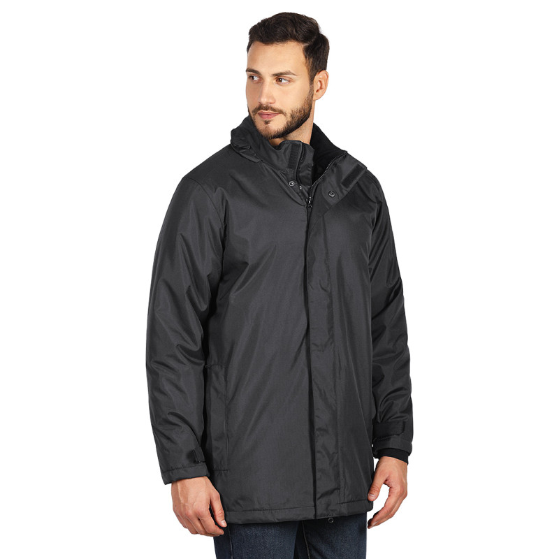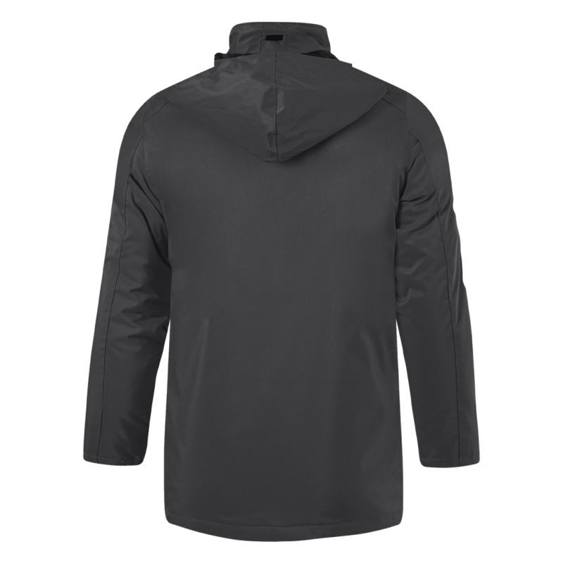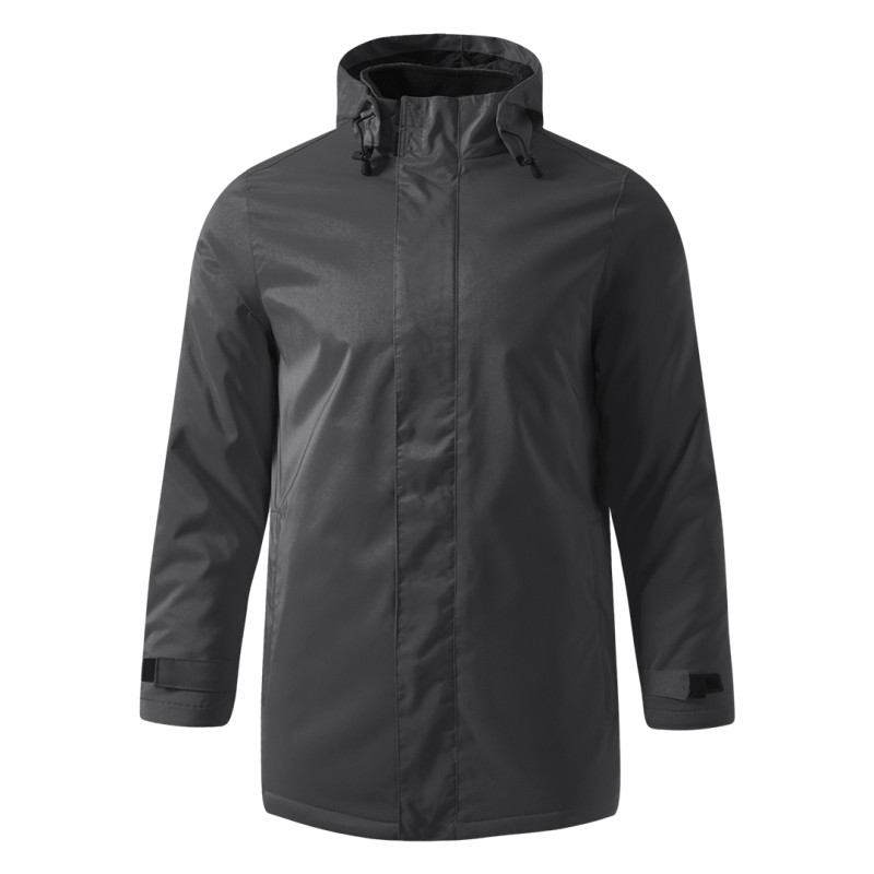 Jacket with high collar, flap with press studs, hood with elasticated drawstrings and stoppers folded inside the collar, velcro sleeve adjustments, two front zippered pockets and one inner pocket, lining combination of fleece and quilted taffeta, with zipper on inside of back for easier printing access