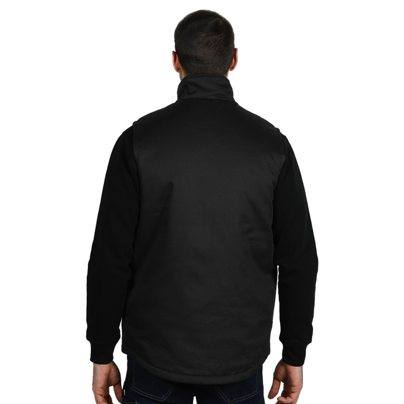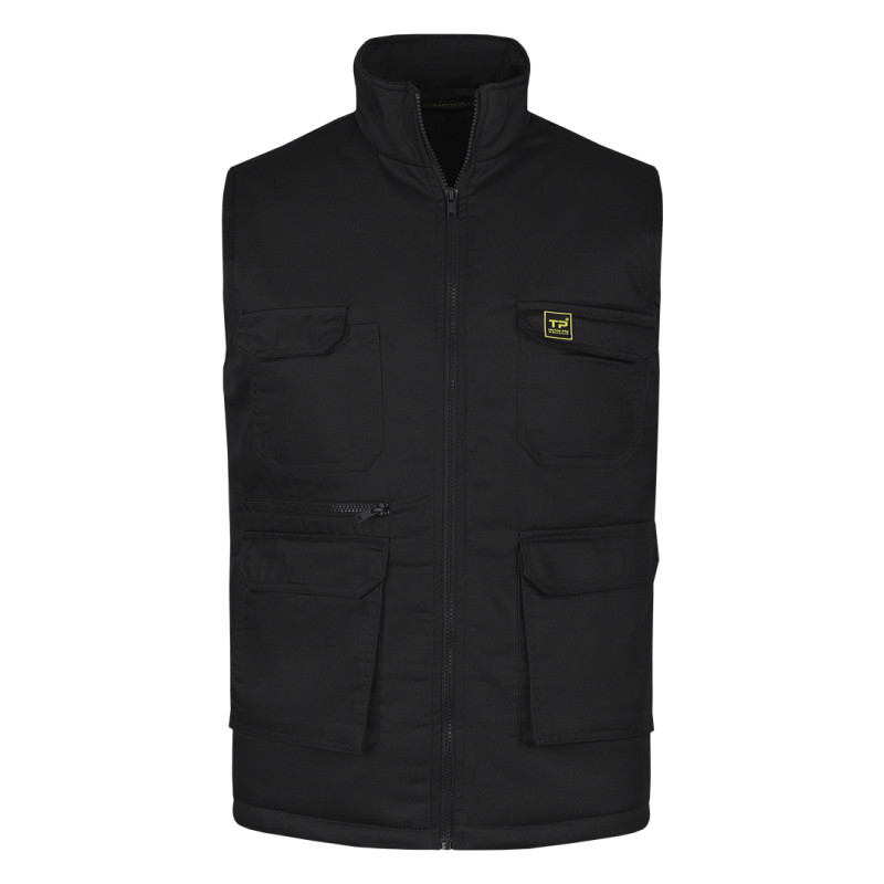Work vest made of twill with lining, a high collar, and a practical pocket arrangement – four front flap pockets and one zippered pocket.