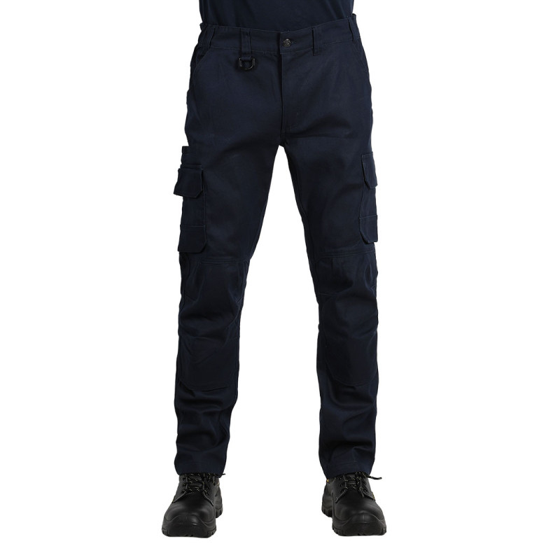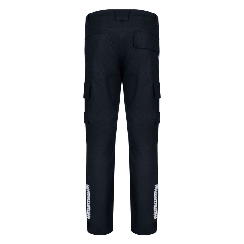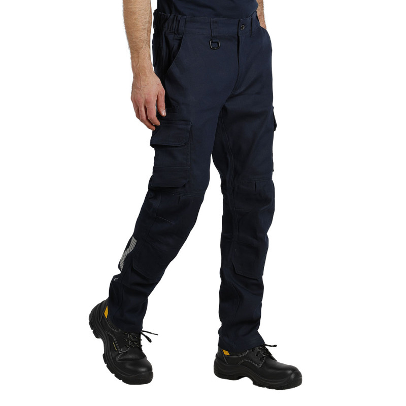 Trousers, 295 g/m², twill, two front pockets, two back pockets, and two side pockets, D-ring on the front for attaching tools, knee-pad pockets, and reflective print on the legs.