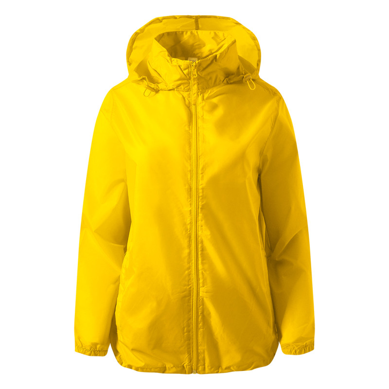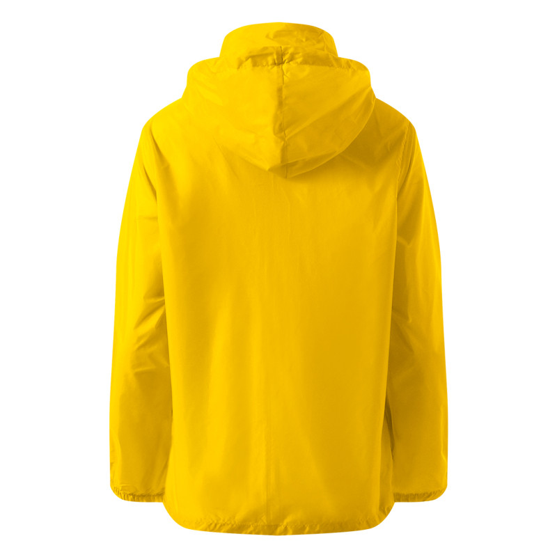 Windbreaker with high collar, hood with stoppers folded inside the collar, collar closed with velcro tapes, two front zippered pockets, elasticated cuffs, adjustable tone-to-tone drawstrings with stoppers at bottom, “in bag/pocket” folding system (right pocket)