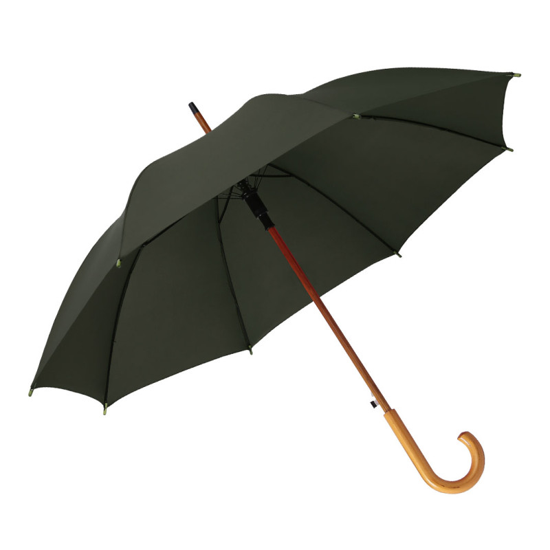 Umbrella with 8 panels, curved wooden handle, wooden shaft (Ø 14 mm), top and tips
