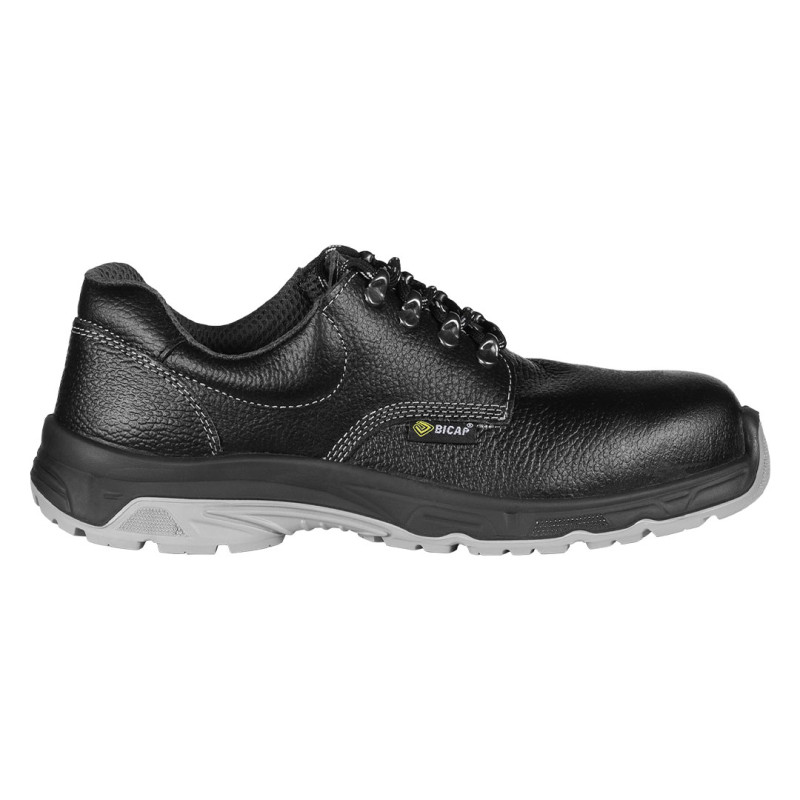 Low-cut work shoe, S3 SRC Upper: printed leather water resistant + synthetic Lining: breathable with high steaming permeability Toe cap: steel Midsole: stainless steel Sole: double - density polyurethane Fussbett: TOP BASIC